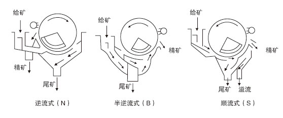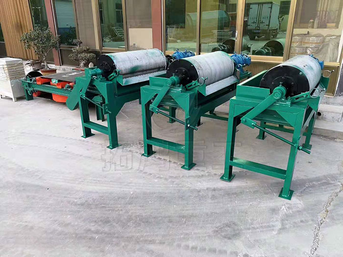 CTS、CTN、CTB系列永磁筒式磁選機磁場分旋轉式、固定式兩種機構,固定式主要適用于弱磁場濕式選別細顆粒的強磁性物質,或者除去非磁性礦物中的強磁性礦物,當漿流入磁場區時,其中強磁性礦物被吸附在圓筒表面,弱磁性和非磁性礦物被分選后排除,而吸附在圓筒表面的強磁性礦物隨圓筒的旋轉被帶出磁場區。旋轉式適用于細粒強(中強)磁性礦物的干選,由于高速旋轉的作用,使磁性顆粒的磁滾翻次數大大高于普通磁選機,這對于破環磁團聚,提高富礦比具有顯著的效果,礦物經分選后被分離成磁性物和非磁性物兩種,分別從各自的排礦口排出該機,適用于礦石粒度為0.6-6mm的粗選和精選?!?同一圓筒可配三種槽體,即順流槽(CTS)選別粒度≤6mm,逆流糟(CTN)選別粒度≤0.6mm,半逆流槽(CTB)選別粒度≤1mm。